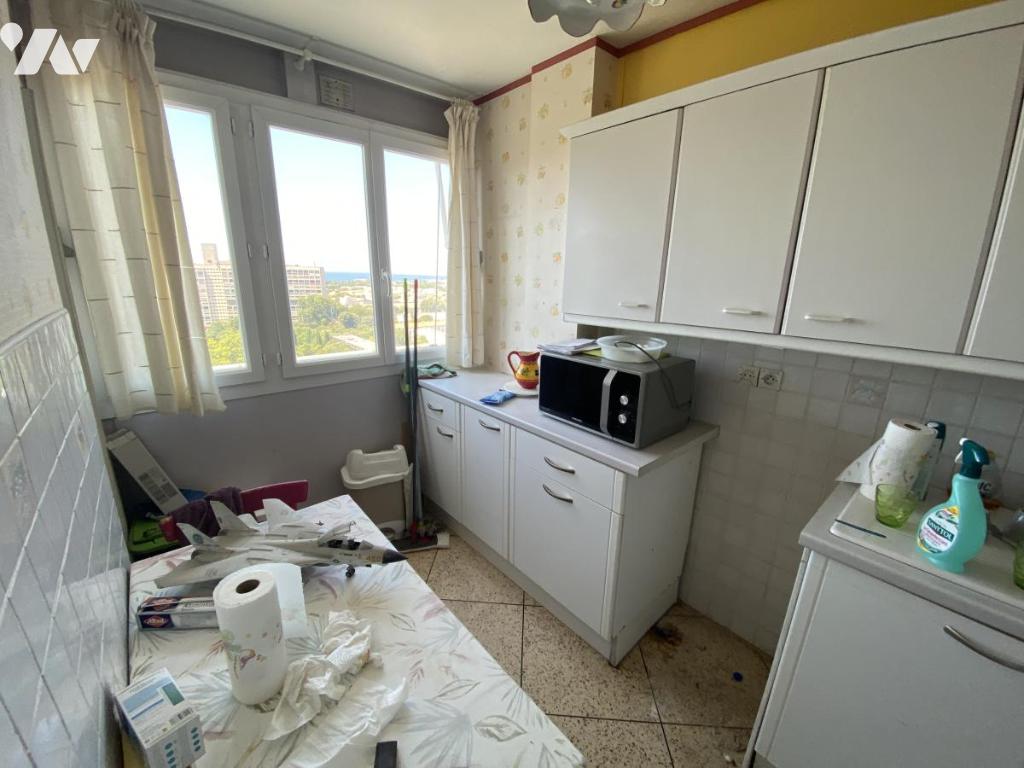 Nouveau Parc Sévigné 13009 - Appartement T4, 71.42 m² carrez, composé d'une entrée, séjour ouvrant sur balcon, cuisine séparée, dégagement, trois chambres dont deux avec accès balcon, dressing, salle de bains, toilettes séparés, cave. Au 15ème étage avec ascenseur, ce bien traversant offre une vue mer panoramique unique. A rénover (sauf double vitrage).
